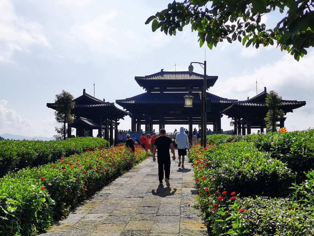 (2)敲钟望茶亭。这是贡茶园四大茶亭中地势最高的敲钟望茶亭。这个亭子最初的功能,是用来接待前来收贡茶的官员,是茶园中很有气魄的建筑物。站在端头的眺望台,-眼望去,远山茶海风光尽在眼前,茶树碧绿连绵,绿浪翻涌;钟声在耳边阵阵回荡,经久不衰;在这里,我们感受着茶亭之名,遥想当年收茶备贡的盛景。